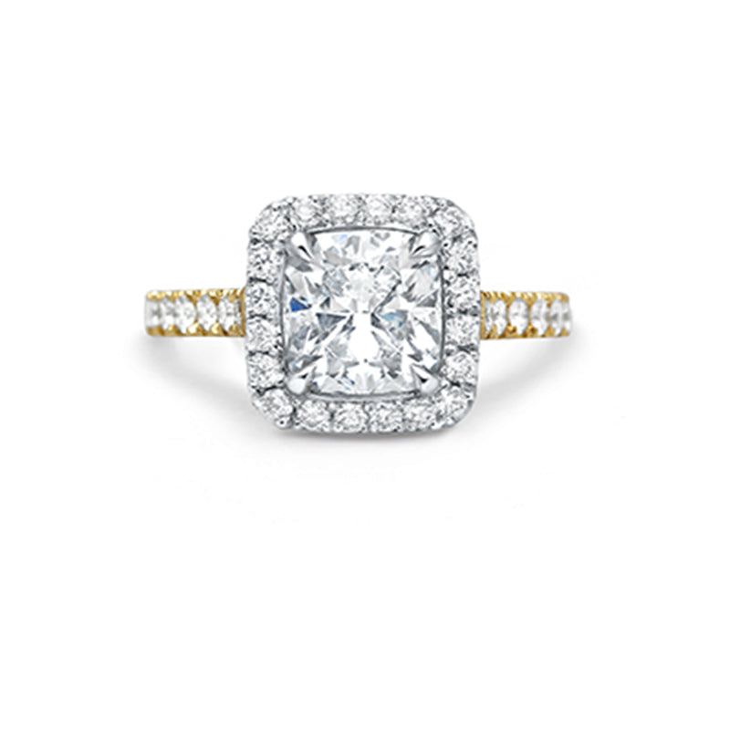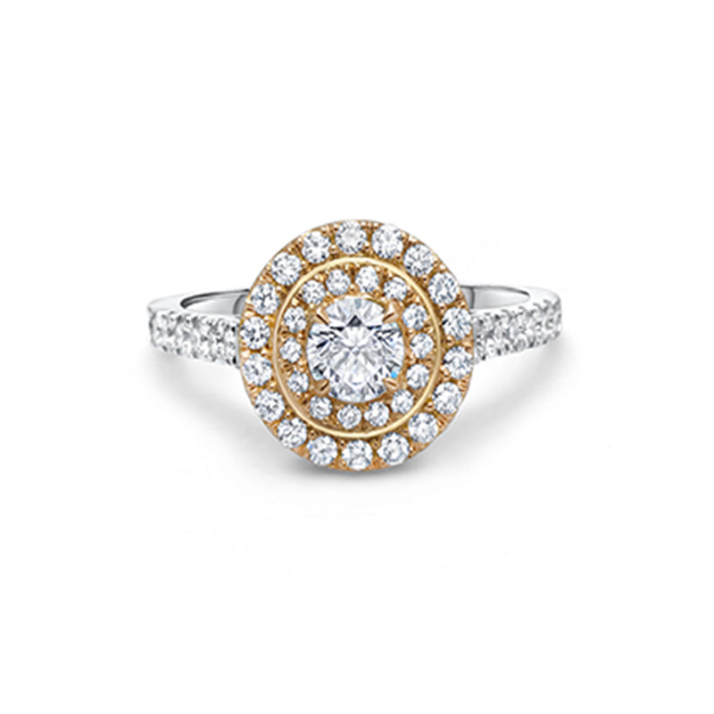 If one row isn't enough, this two row halo really catches the eye. Set into a rose gold head, it really give this halo a unique twist.