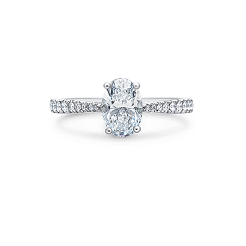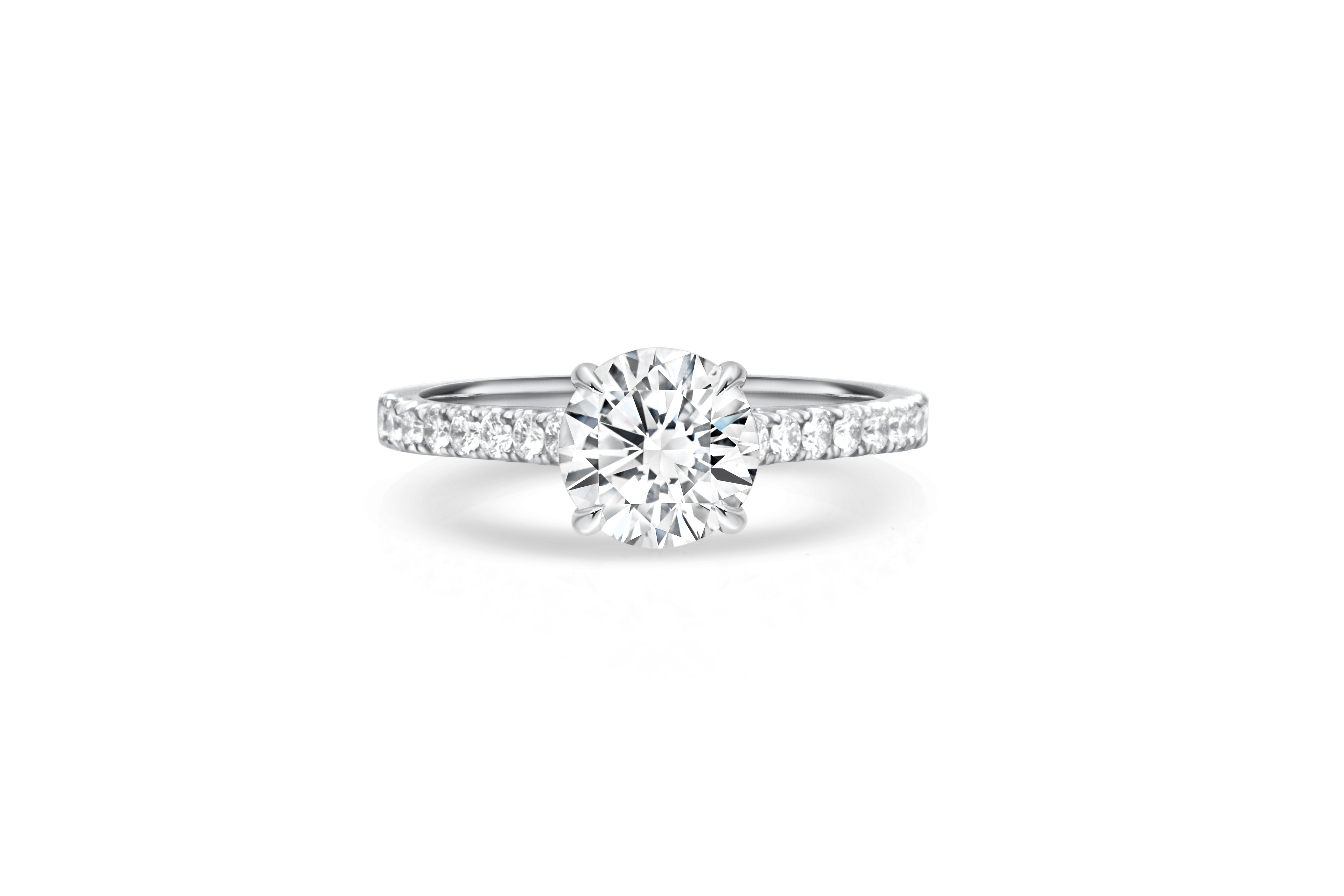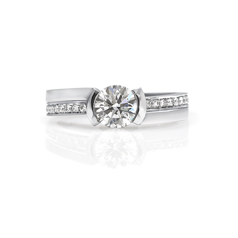 A design that is a little more interesting than your usual solitaire ring, boasting 30 diamonds that run diagonally across and under the centre stone. Handmade in platinum using a 1.10ct EVS diamond for the centre stone.