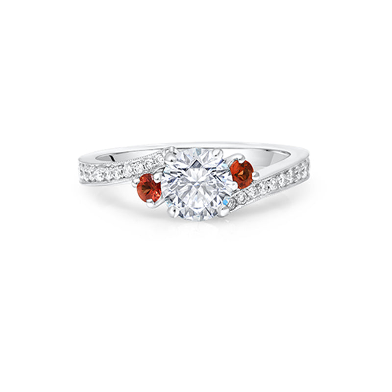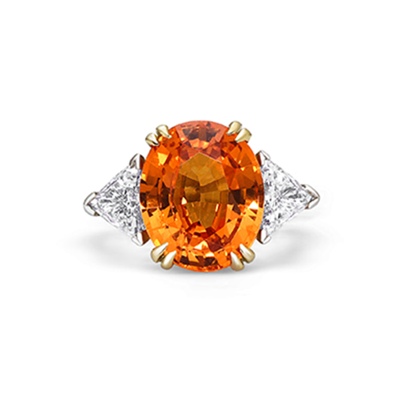 After an interesting design process James and I finally arrived at this, a cross between a twist ring and the ever popular three stone. Colour was an important factor which we achieved with a splash of orange from these gorgeous sapphires.