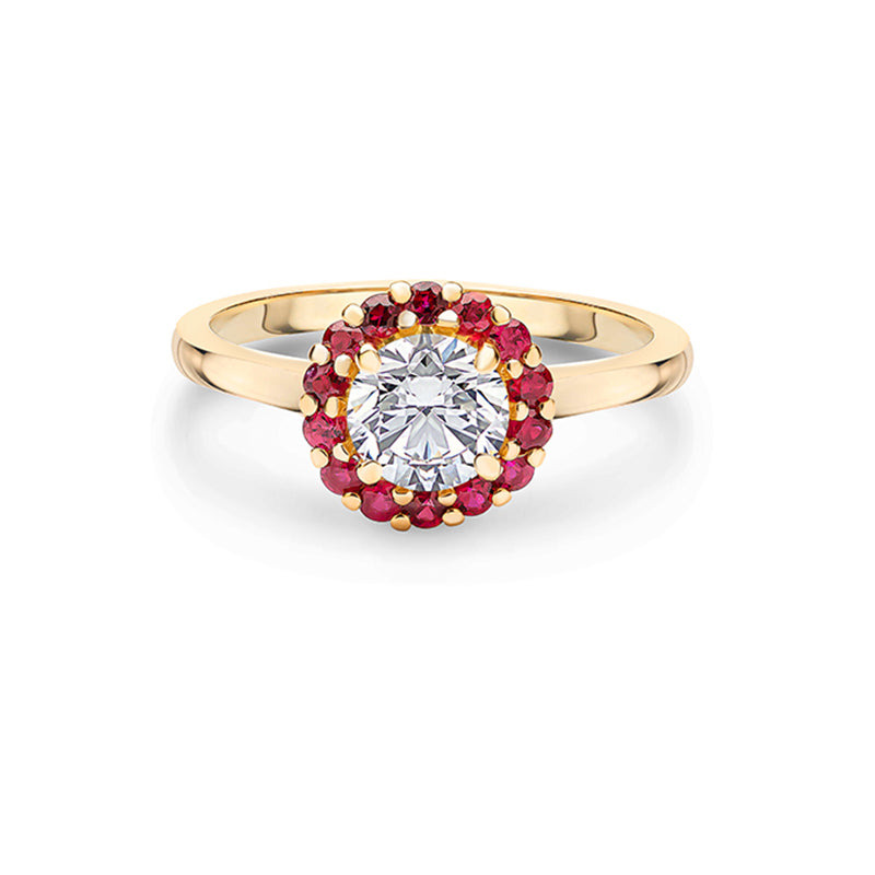 The use of rubies transforms this piece from your average halo to this uniquely striking ring. Hand made in 18ct yellow gold using recycled rubies, adding that sentimental touch.