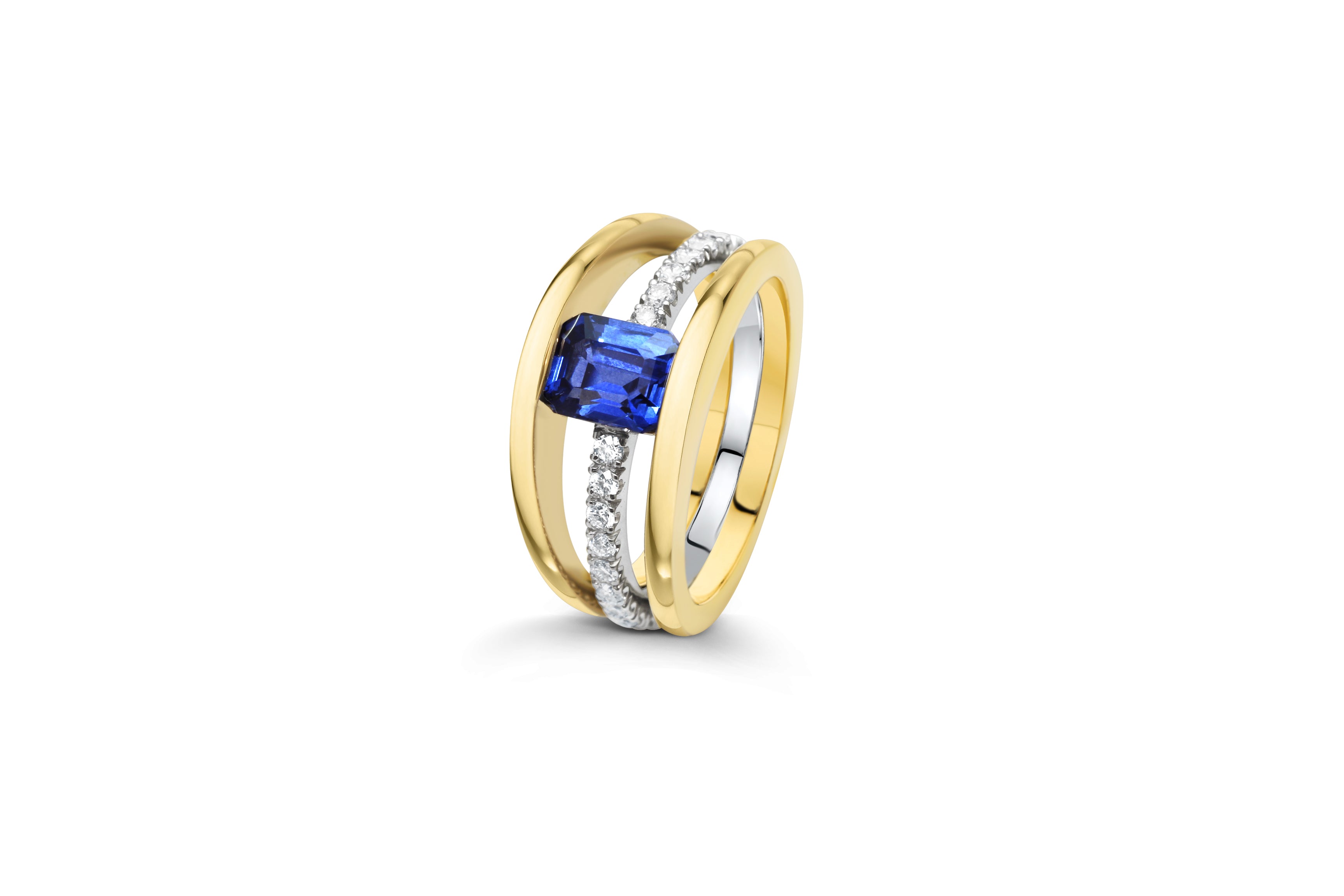 This rich royal blue sapphire contrasts beautifully with the warmth of 18k yellow gold. If that wasnt enough, a band of diamonds passes elegantly through the centre.