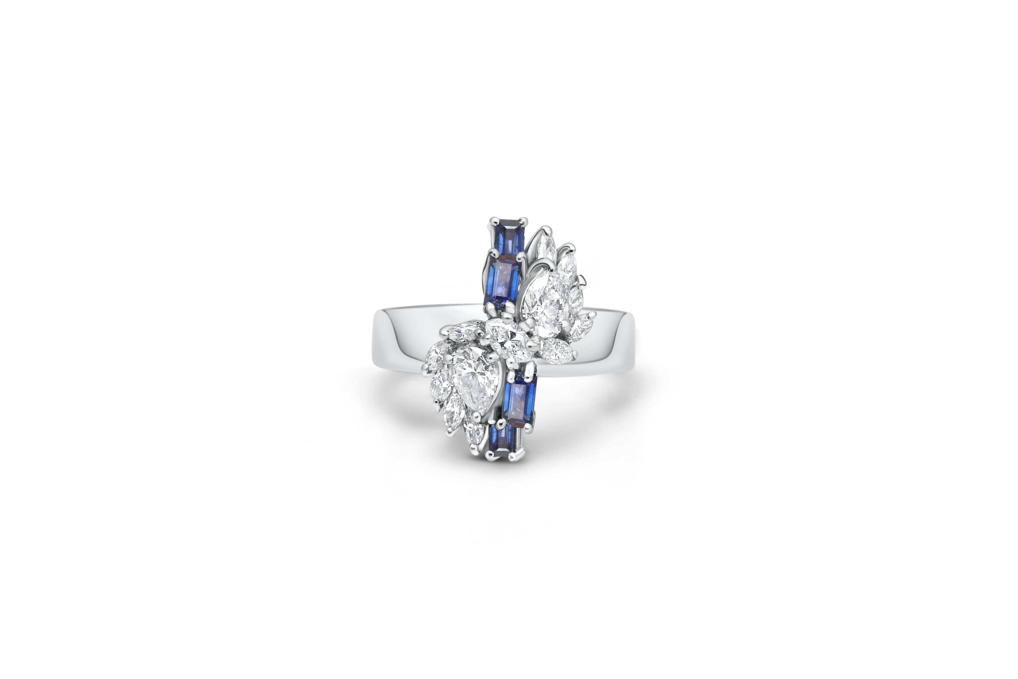 Baguette cut sapphires paired with marquise and pear shape diamonds, handmade in platinum.