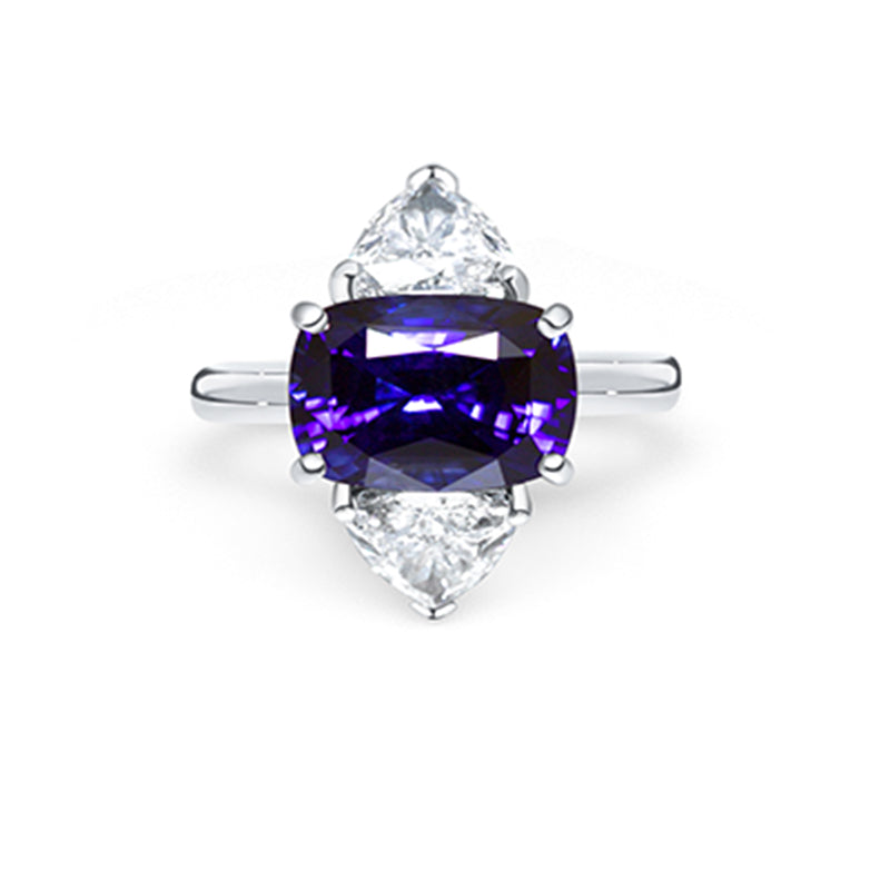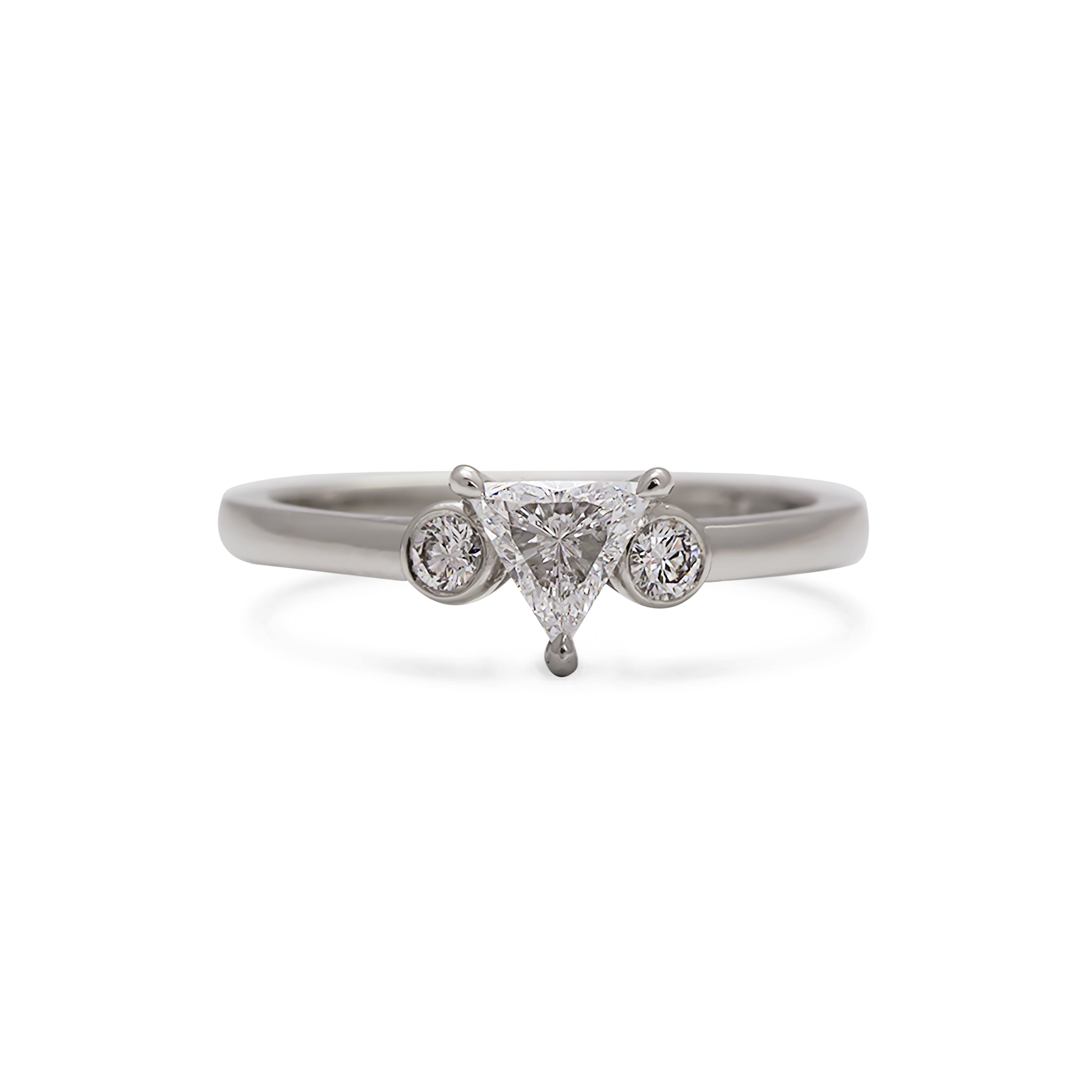 This very unusual design sees the stones set down the finger instead of across it, making it a refreshingly unique ring. Handmade in platinum with a cushion cut centre and two trillion cut diamond side stones.