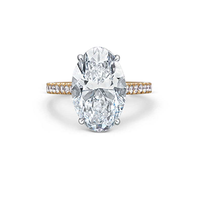 This huge diamond delicately held in a platinum collet seemingly floats above an 18k diamond set yellow gold band.