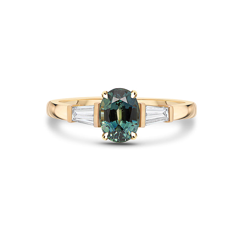 Here we have a gorgeous 0.94ct emerald cut sapphire flanked by two trapeze cut Diamonds, giving this ring an art deco feel.