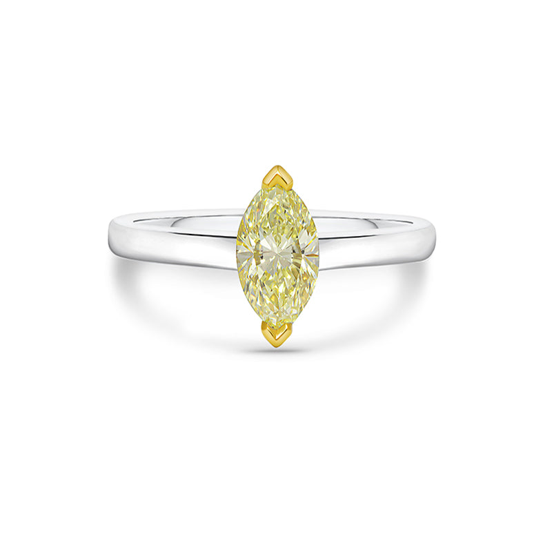 This vibrant piece was handmade for some good friends of ours using a vivid yellow marquise cut diamond. Set in an 18ct yellow gold collet with a platinum shank.